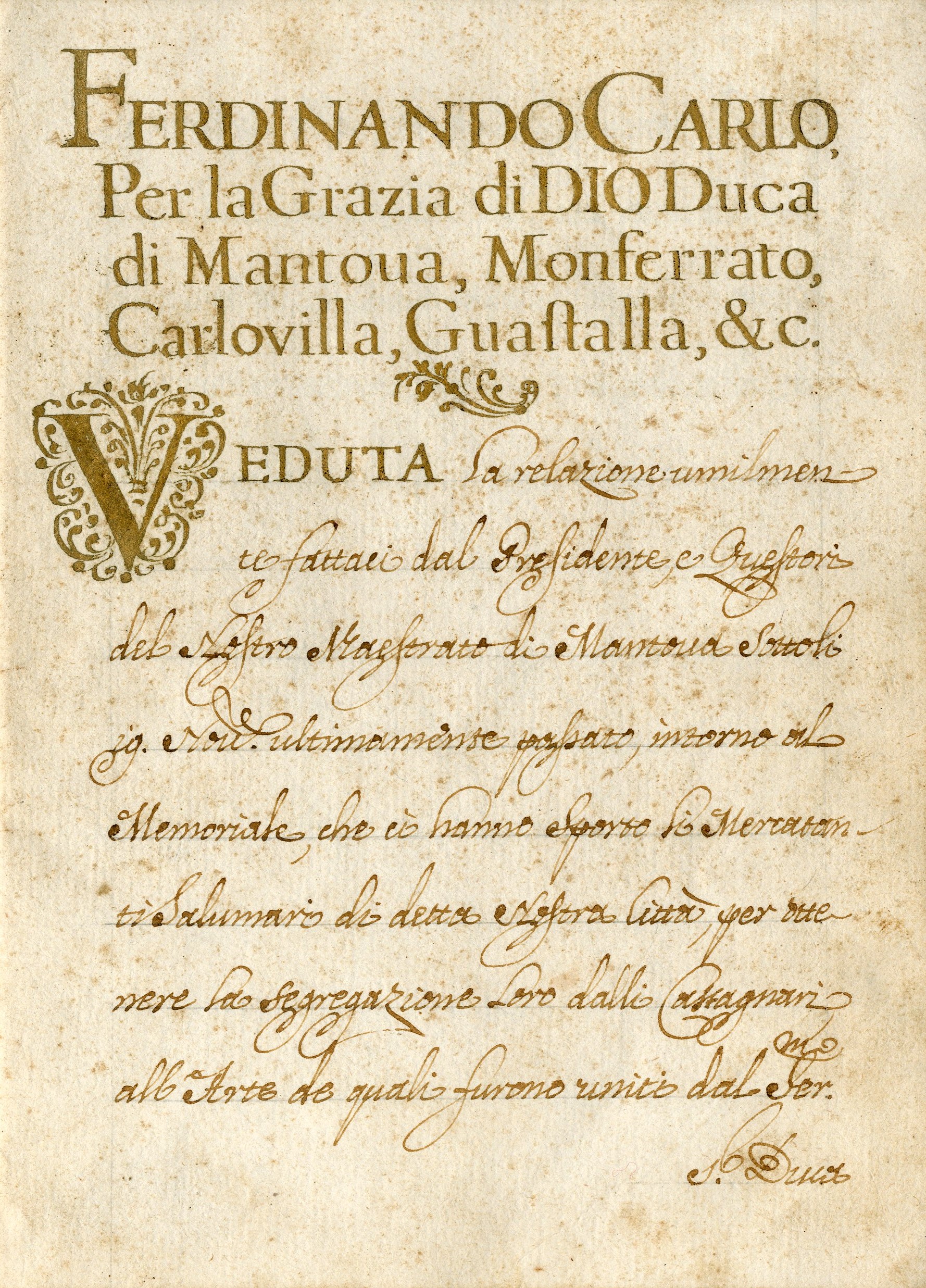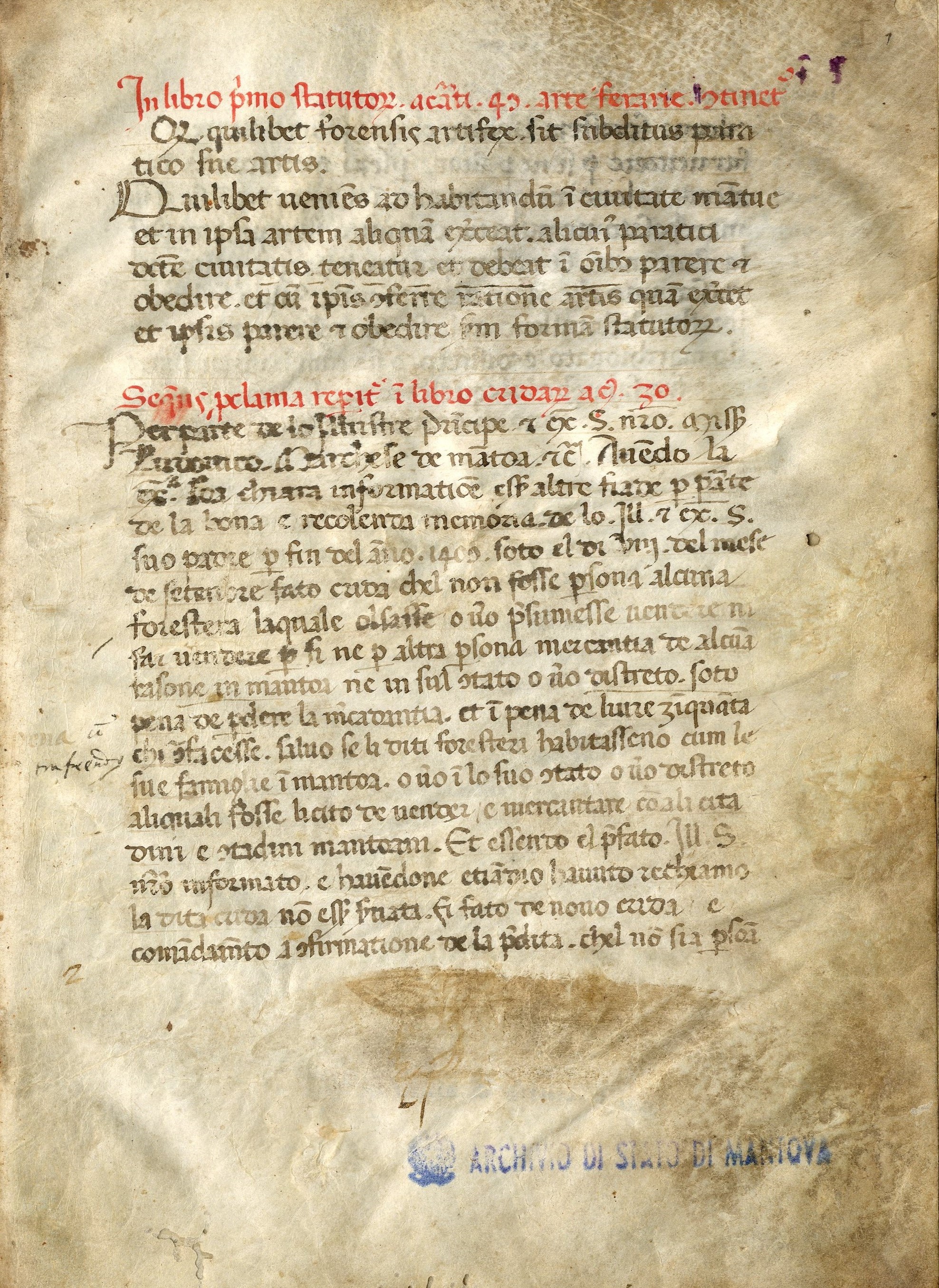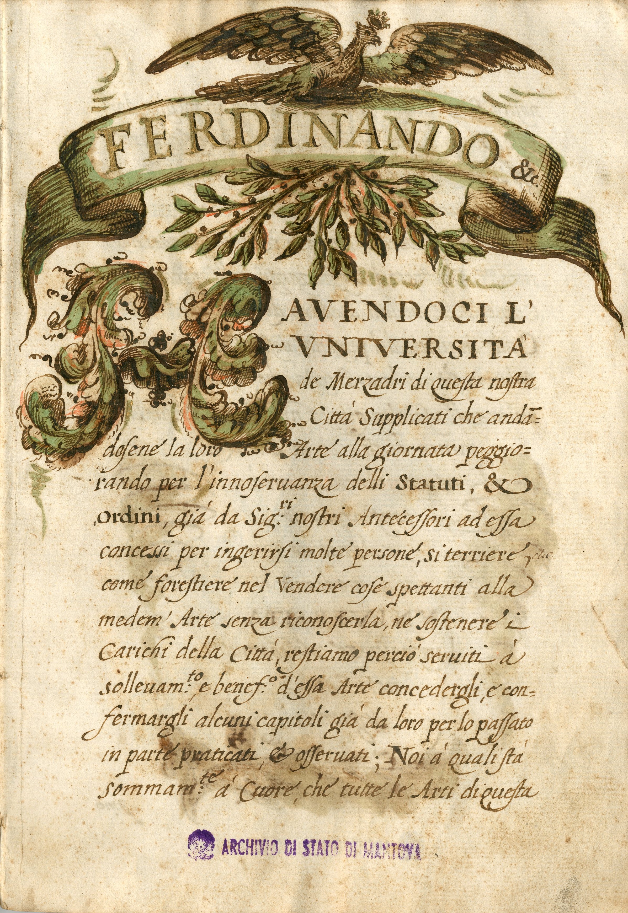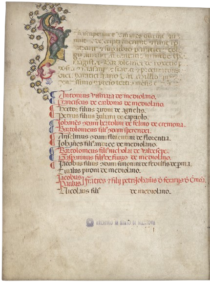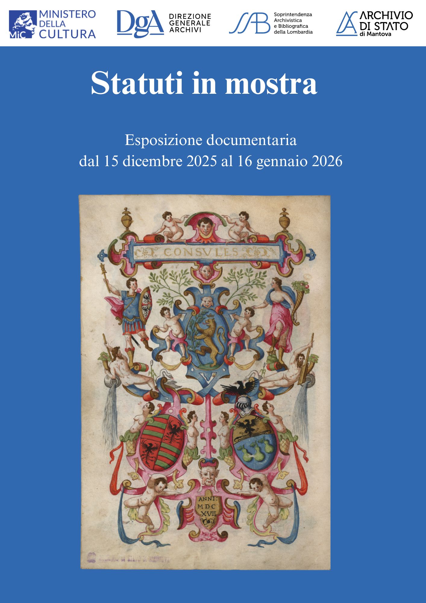 Esposizione di statuti dell'Università maggiore dei mercanti e delle Corporazioni artiere di Mantova. Conservati presso l'Archivio di Stato di Mantova, insieme a innumerevoli altri, nella parte più antica del fondo Camera di Commercio, industria, artigianato e agricoltura di Mantova (1310-1978), gli statuti dei mercanti, dei merciai, dei salumieri, dei fabbri e calderai, dei muratori, degli orefici, dei falegnami sono testimonianza ininterrotta della vita economica e sociale della città a partire dal Medioevo e, nel contempo, rappresentazione di uno status, come attesta la particolare attenzione anche all'aspetto esteriore (preziose miniature e capilettere ornati, coperte lignee e in pelle con chiusure decorate).