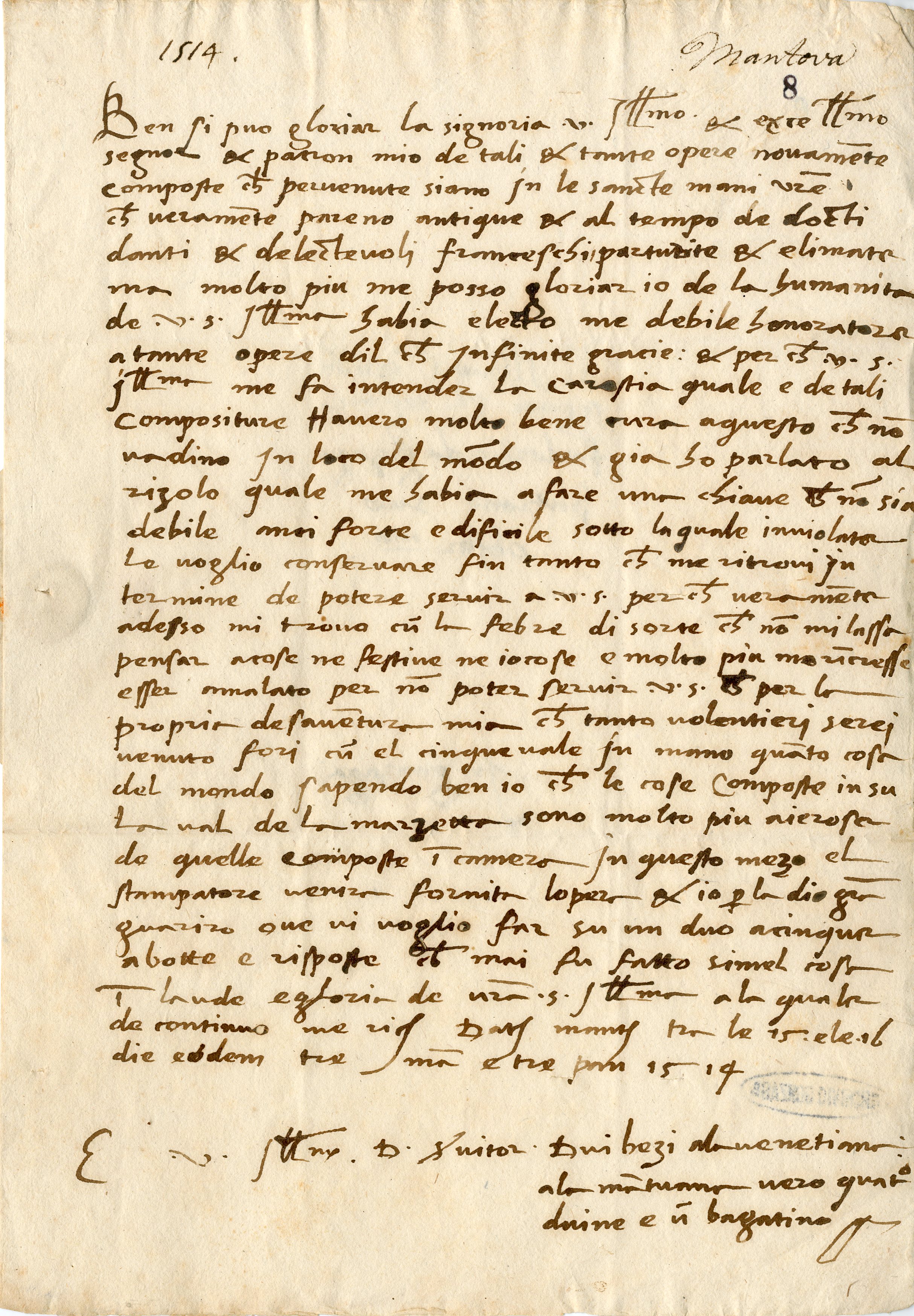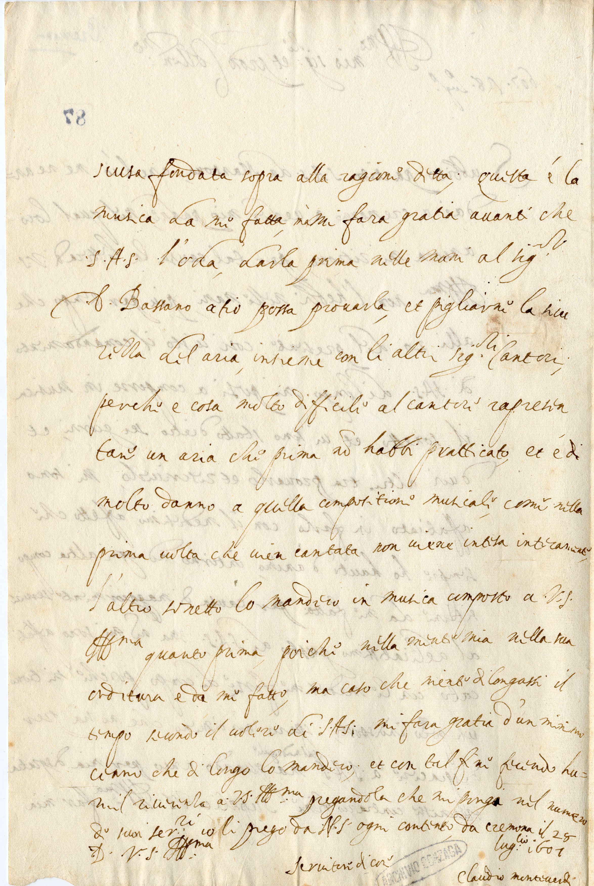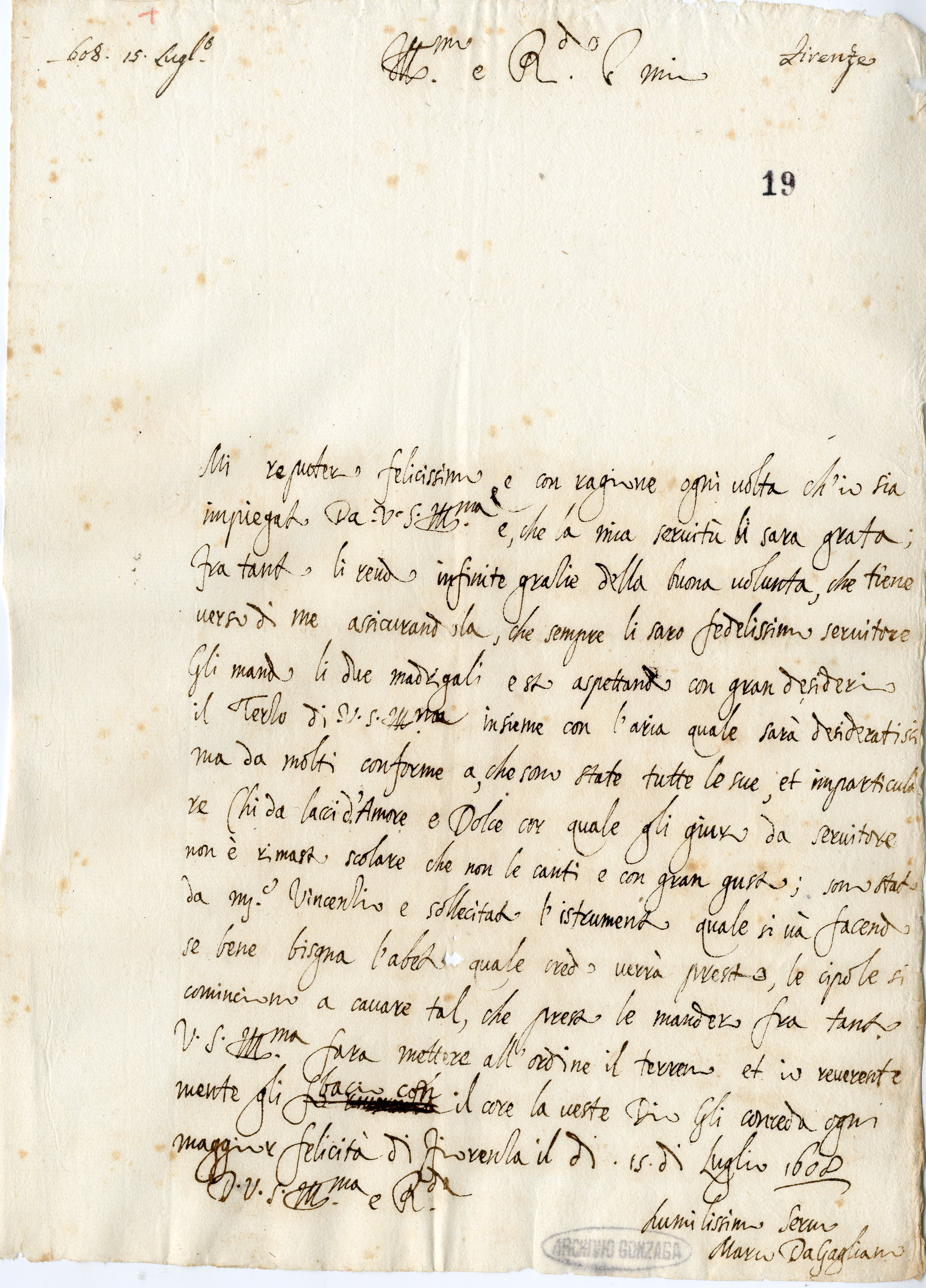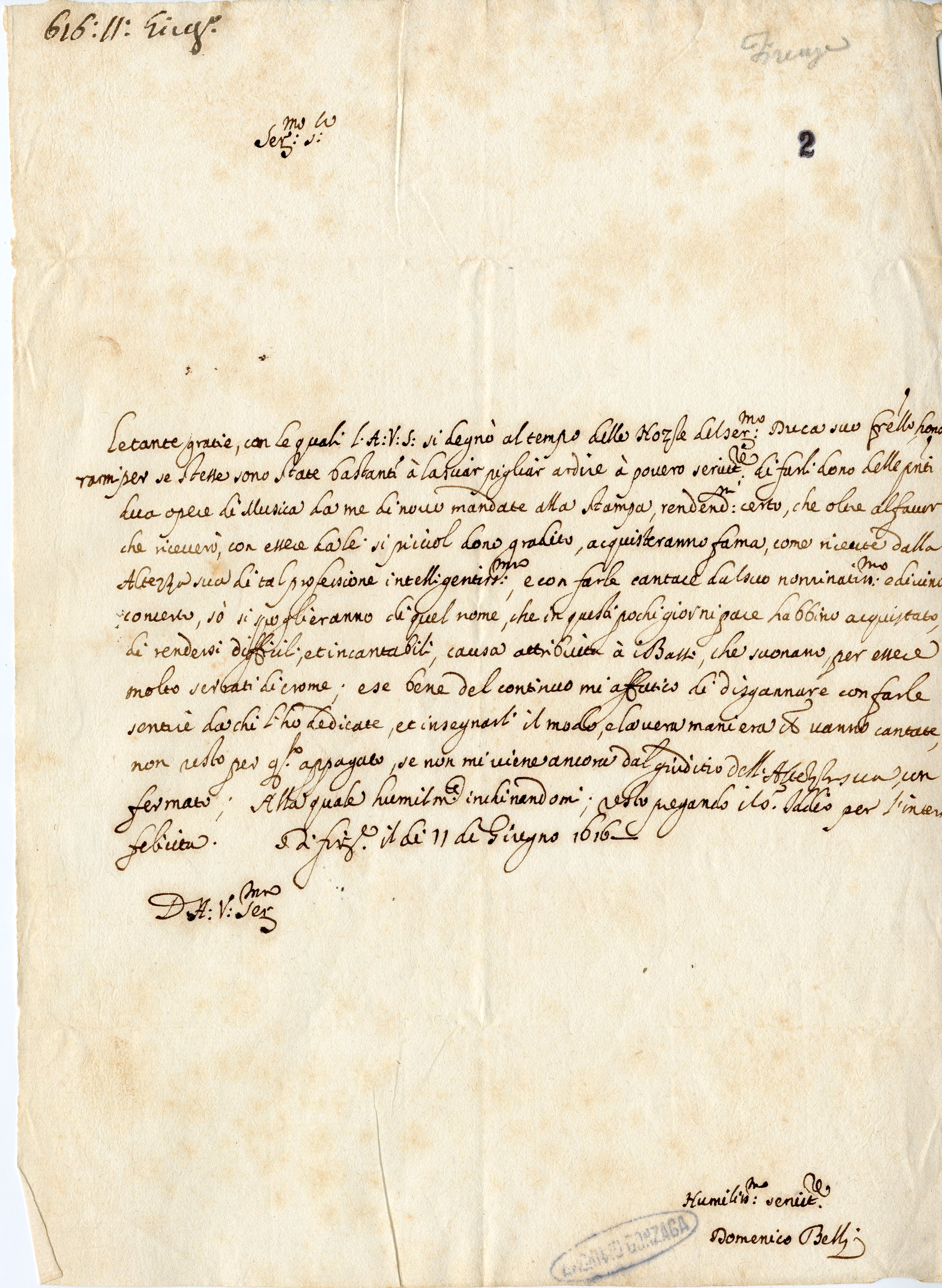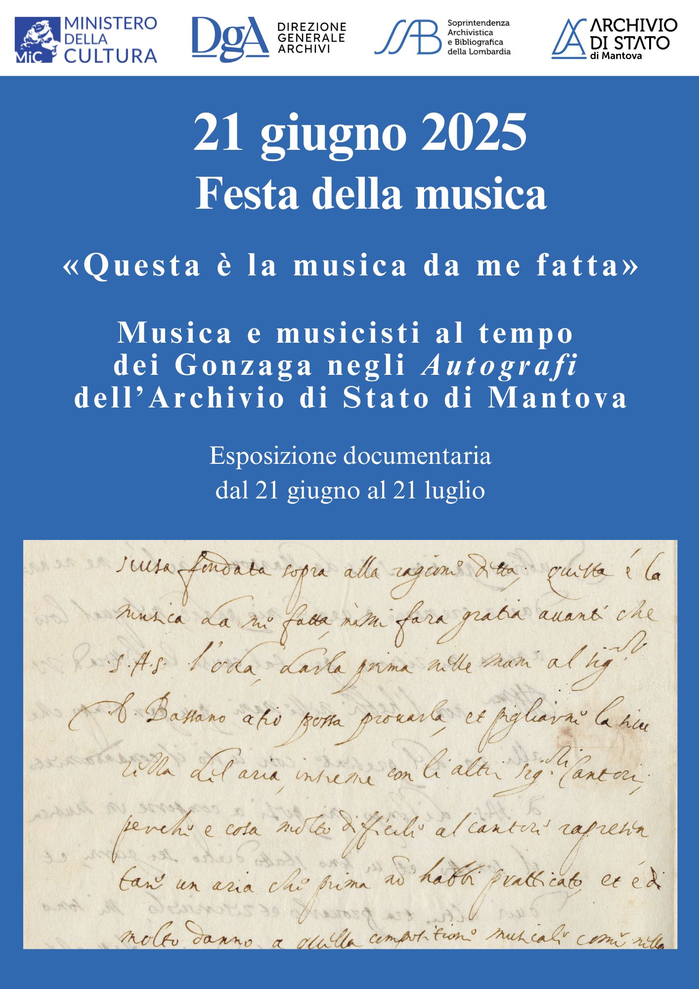 «Questa è la musica da me fatta»: con queste parole di Claudio Monteverdi nella lettera al consigliere del duca Vincenzo del 28 luglio 1607, l’Archivio di Stato di Mantova propone una selezione di 16 lettere, datate dal 1514 al 1622, testimonianza dell’interesse continuo della corte dei Gonzaga verso la musica. Si tratta di lettere in parte autografe, riunite nella raccolta Autografi (1439-1876, bb. 10) di questo Istituto.