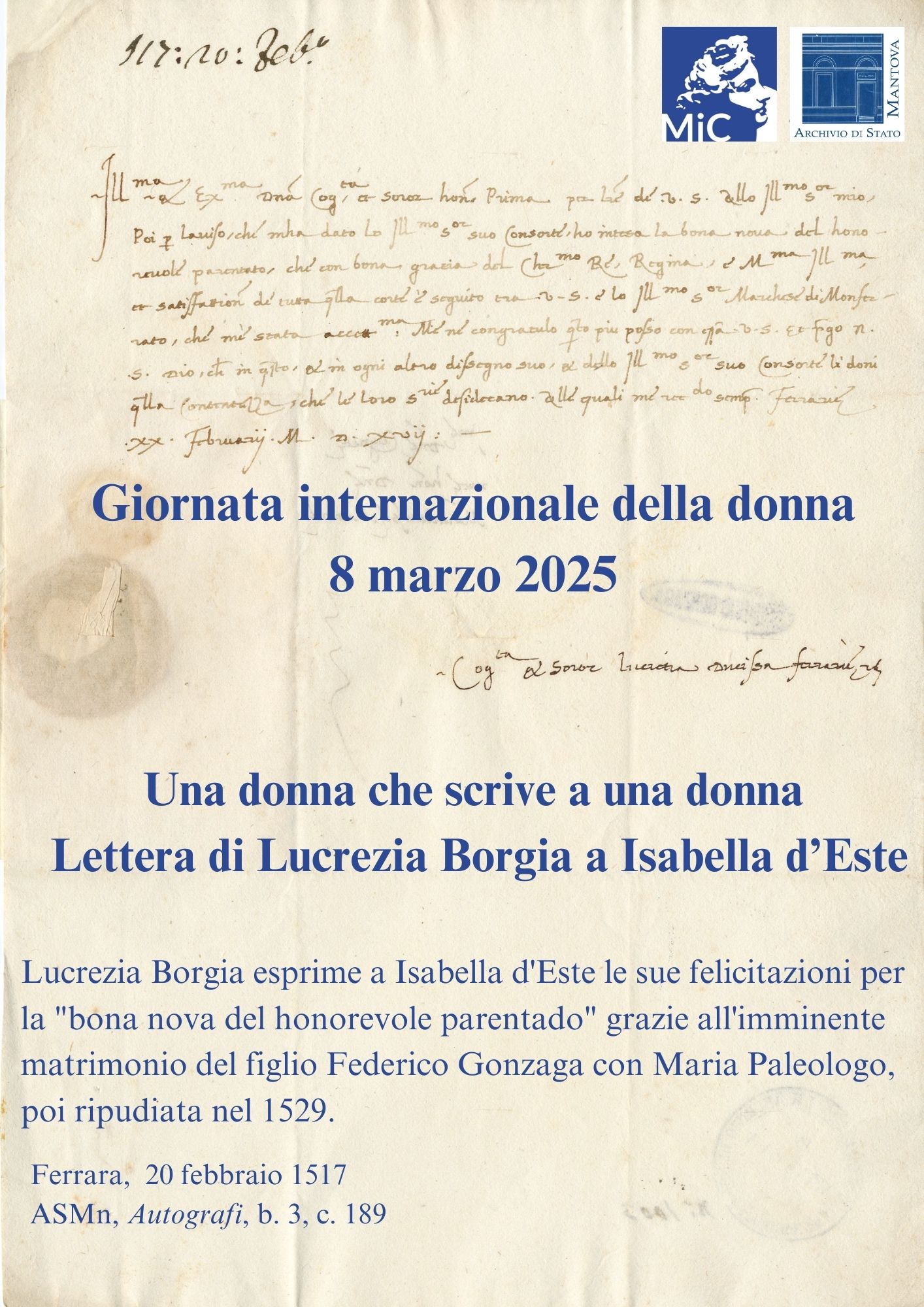 In occasione del Giornata internazionale della donna 8 marzo 2025, l’Archivio di Stato di Mantova presenta una lettera di Lucrezia Borgia.
